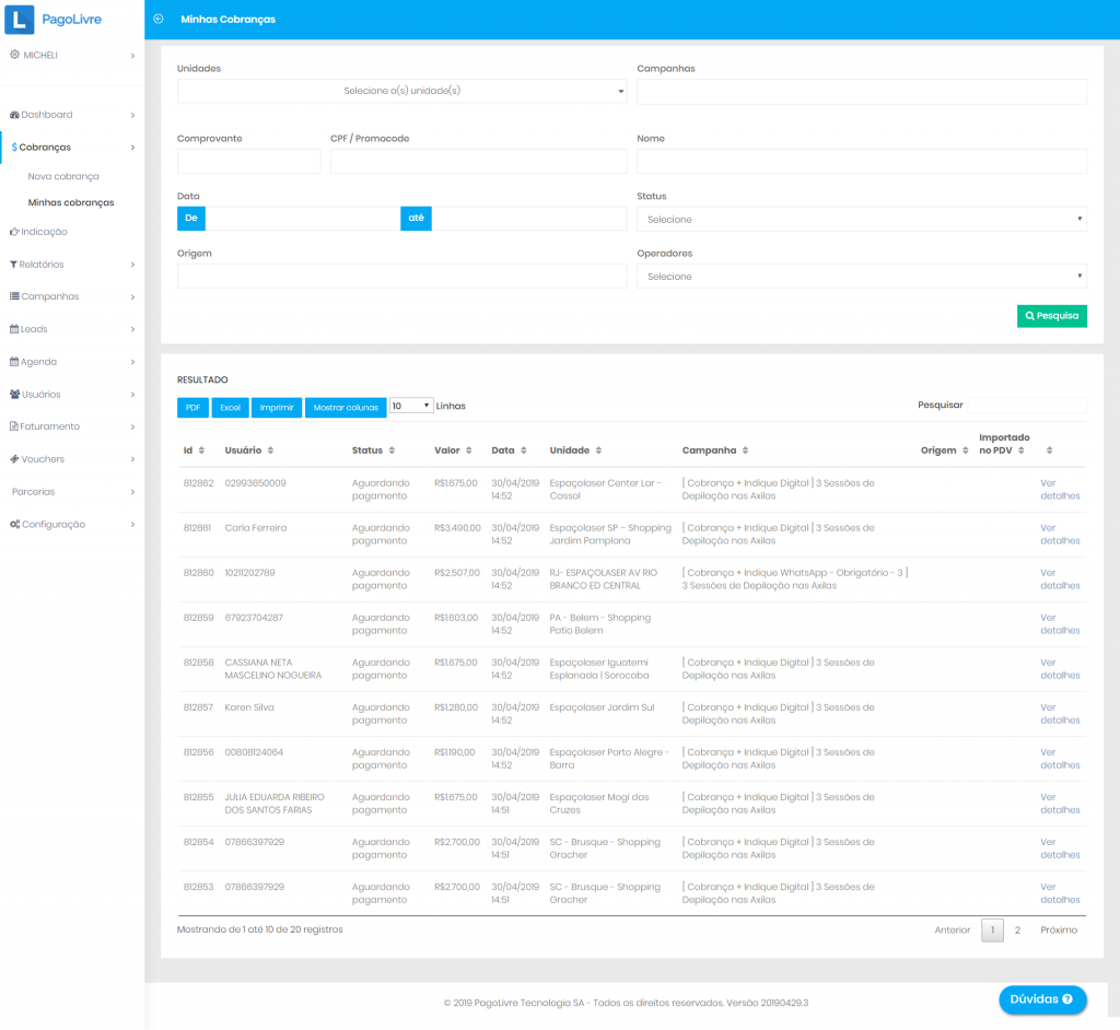 No Portal PagoLivre você seleciona o menu “Cobranças”, à esquerda, e em seguida clica em Minhas Cobranças.